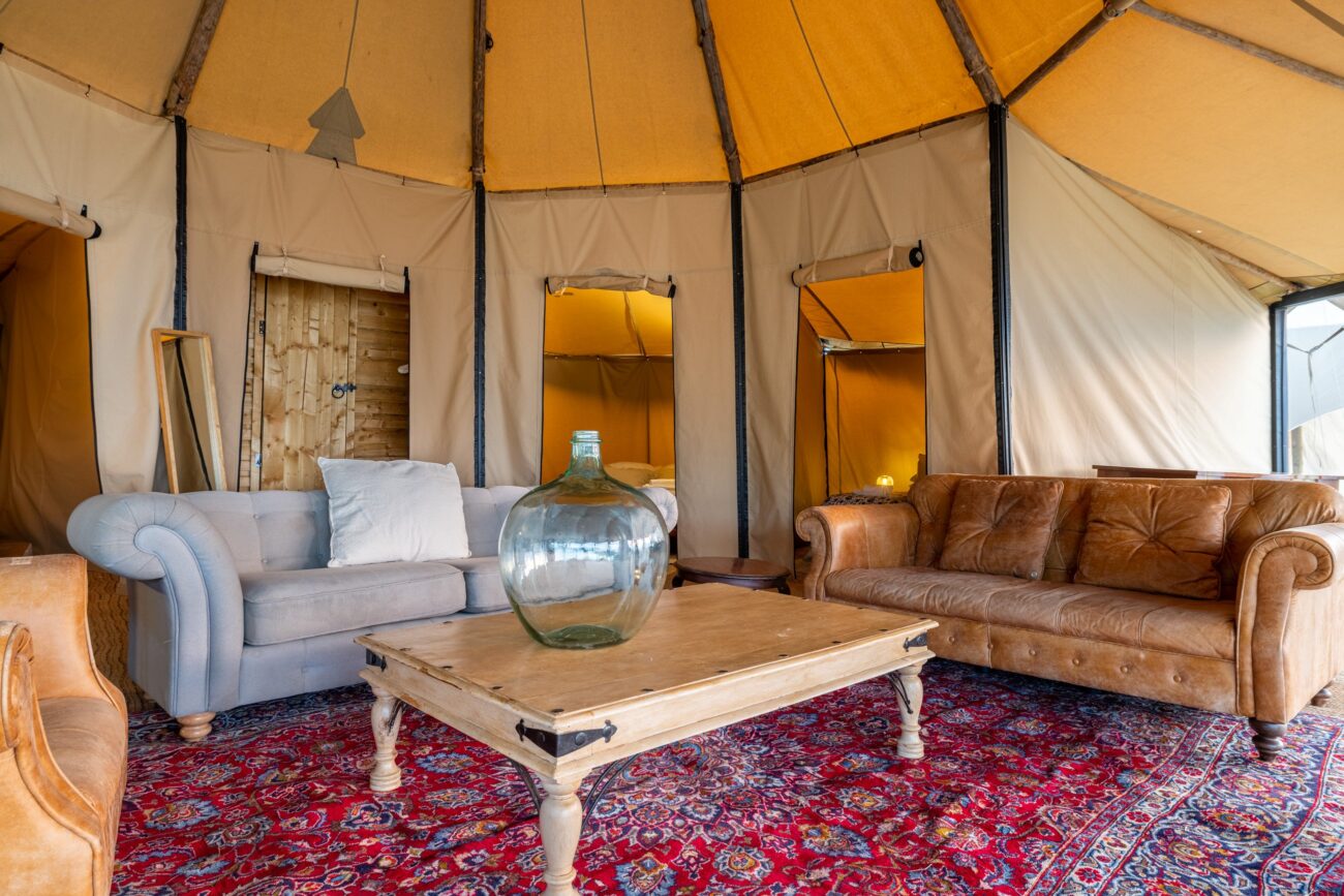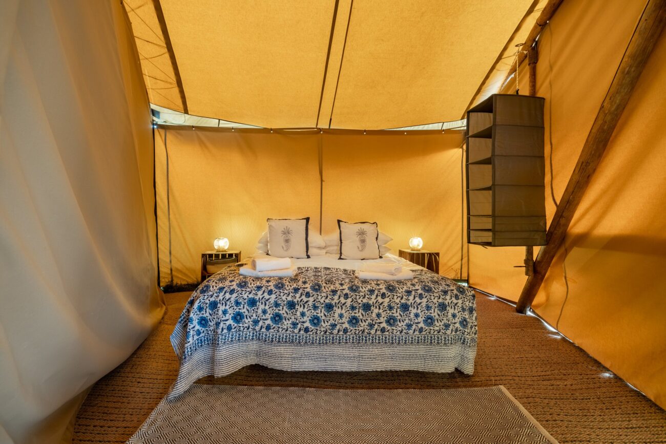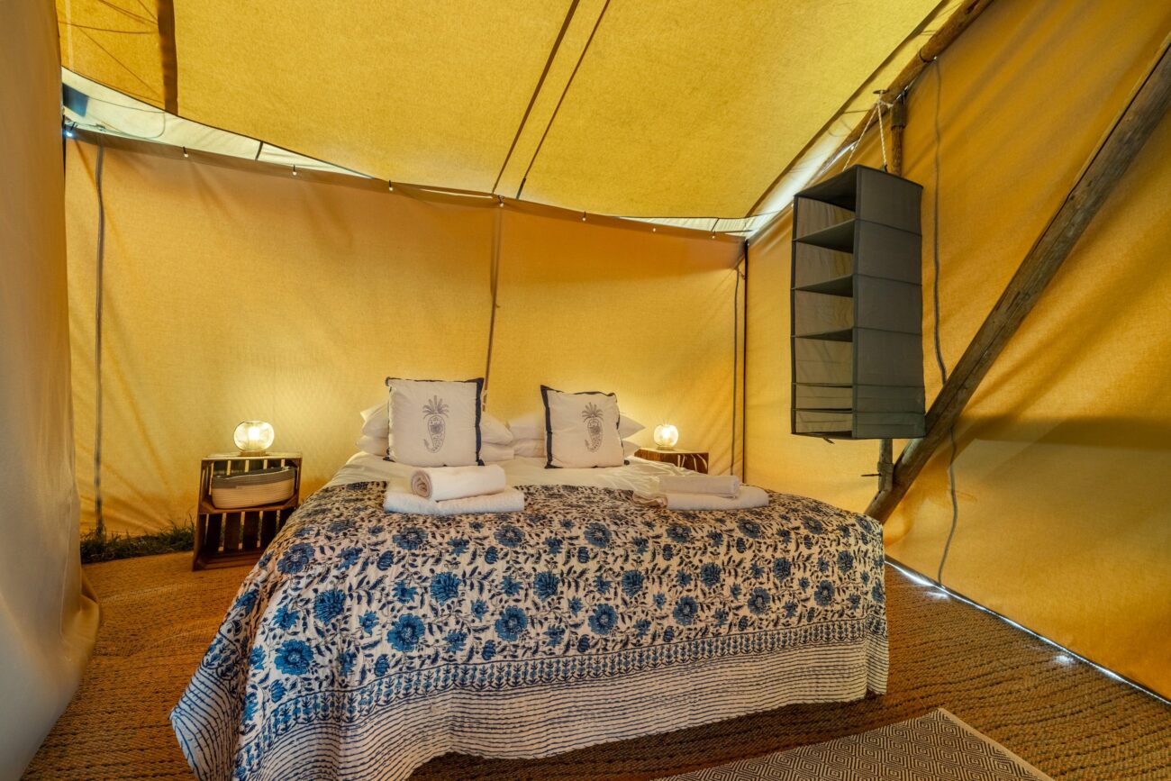 The Deluxe Room, a quality canvas Bell Tent furnished with proper beds, bedding and lighting. Room for 2 guests.