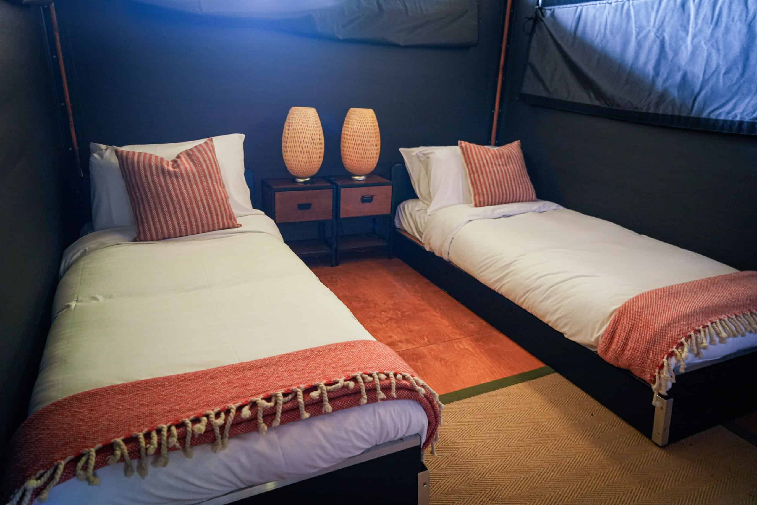 The Cabin Suite boasts a lounge area, mini fridge, and power, with a quiet shared outdoor seating area to debrief on race news with your neighbours.